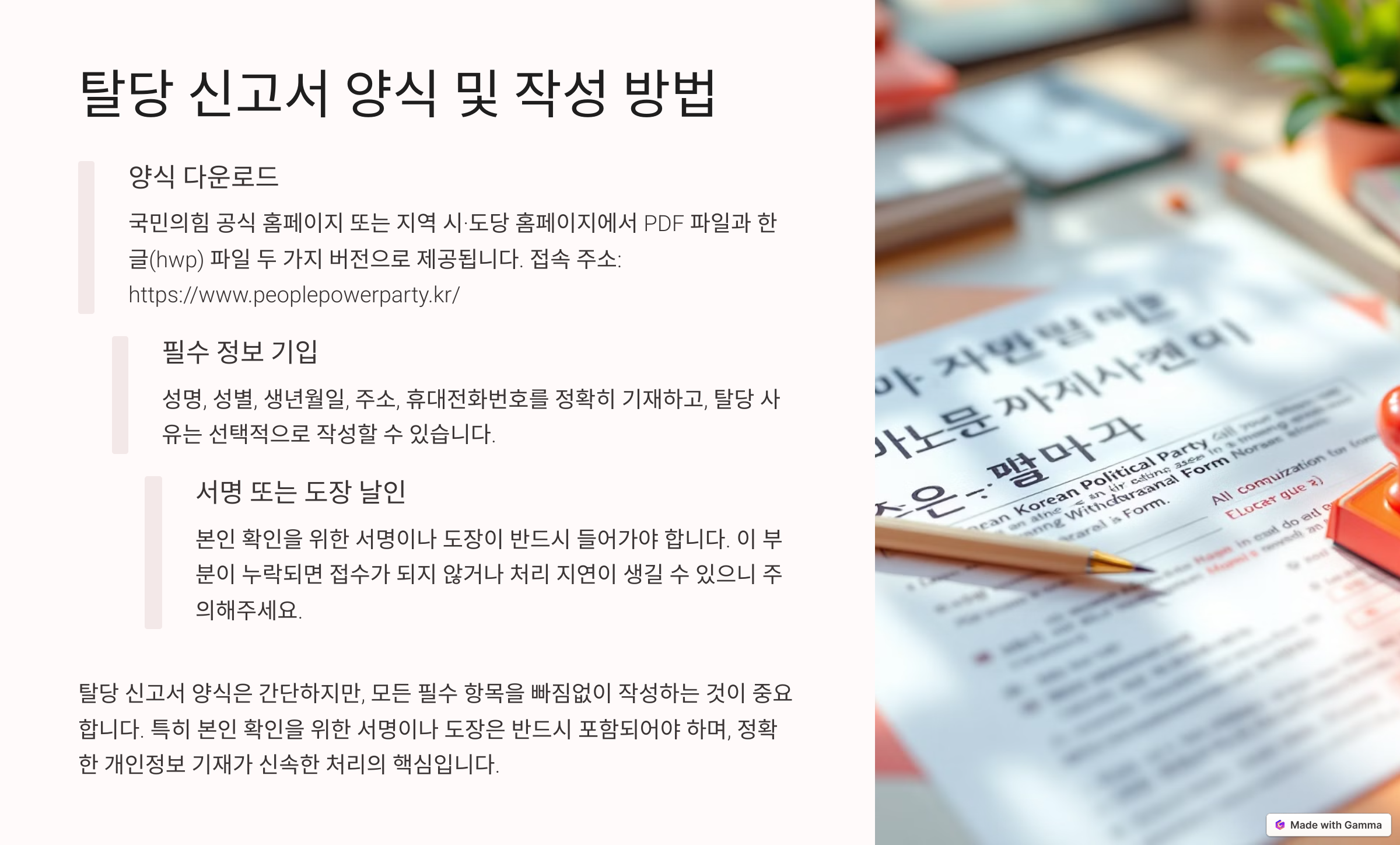 - 온라인 탈당은 불가: 무조건 서면 신청 필요