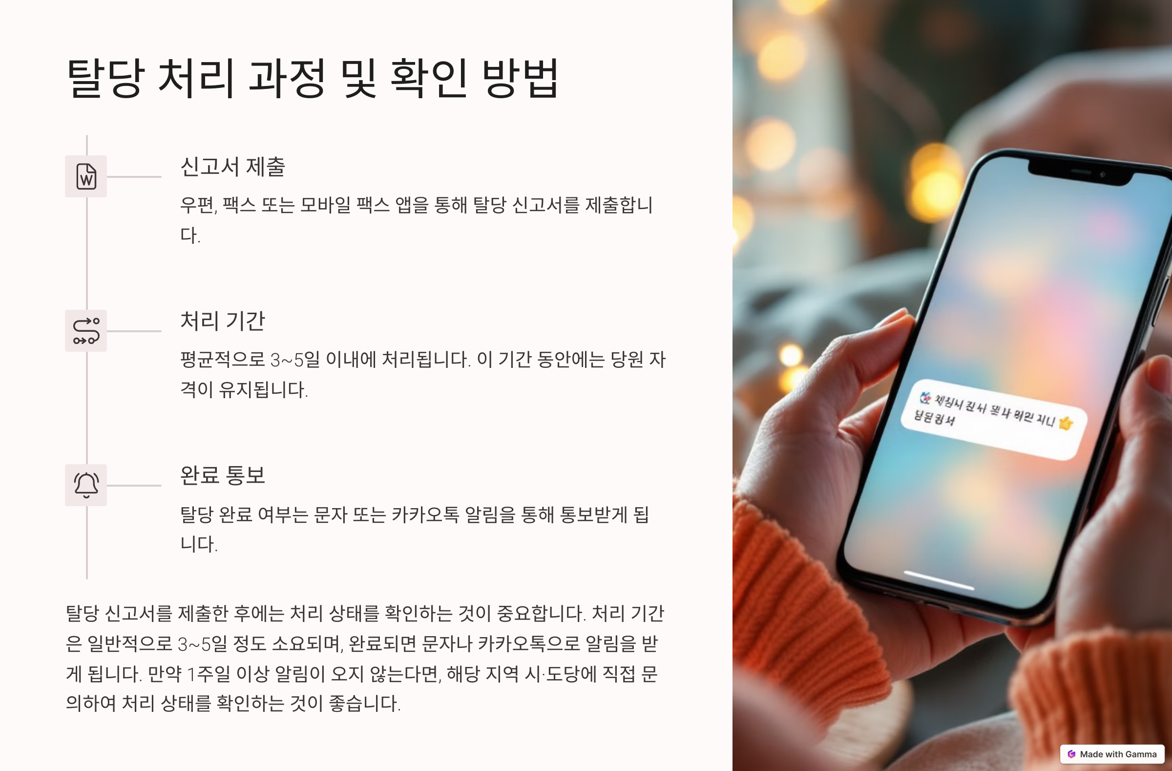 신청서 제출 전에는 사본을 꼭 한 부 보관하는 것이 좋습니다. 이후 탈당이 처리되면 문자 또는 카카오톡 메시지로 안내가 오며, 약 3~5일 소요되는 경우가 많습니다.