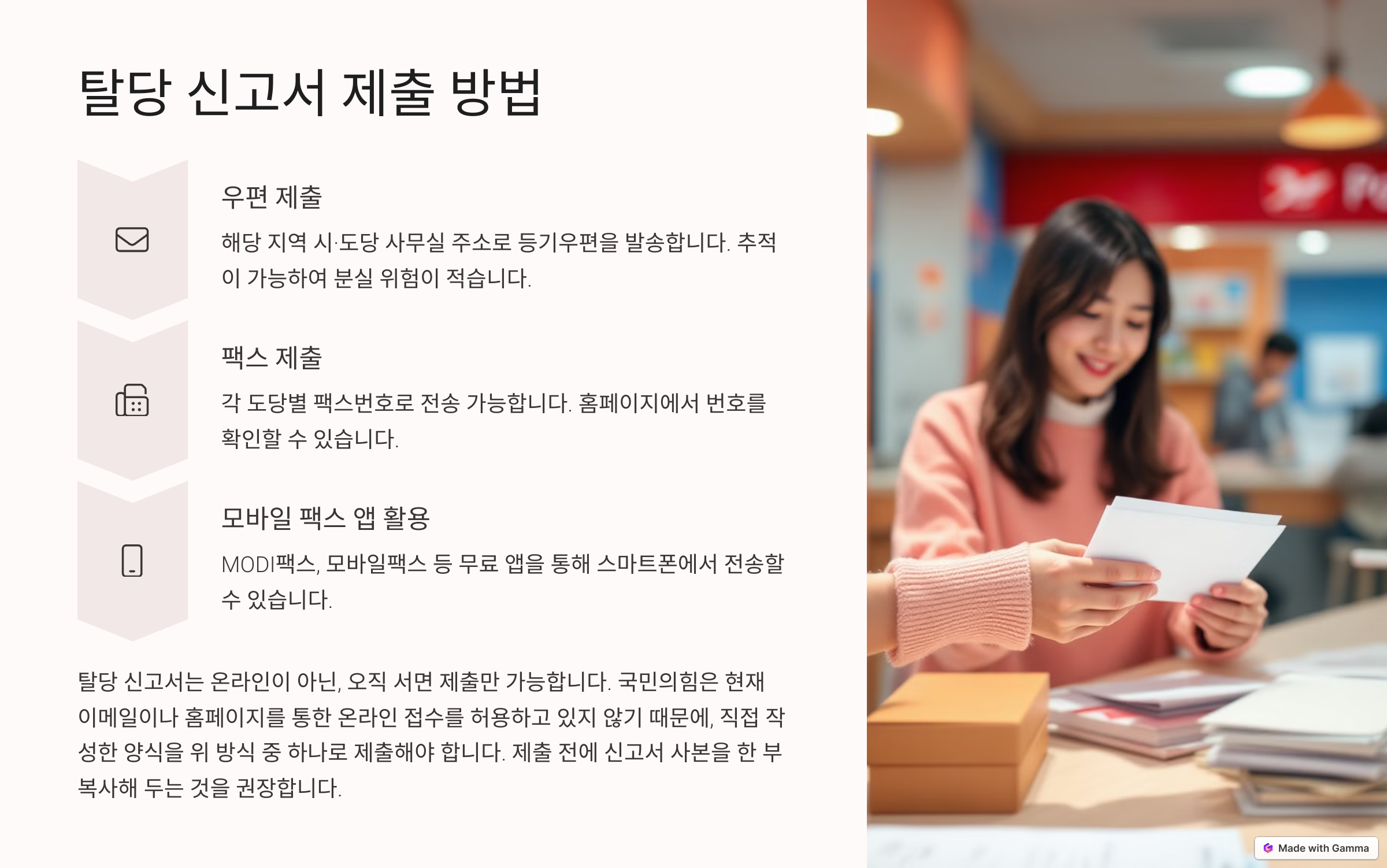 작성한 탈당 신고서는 서면 제출만 가능하며, 온라인이나 이메일 접수는 되지 않아요. 제출 방법은 다음 중 편한 방법을 선택하면 됩니다.