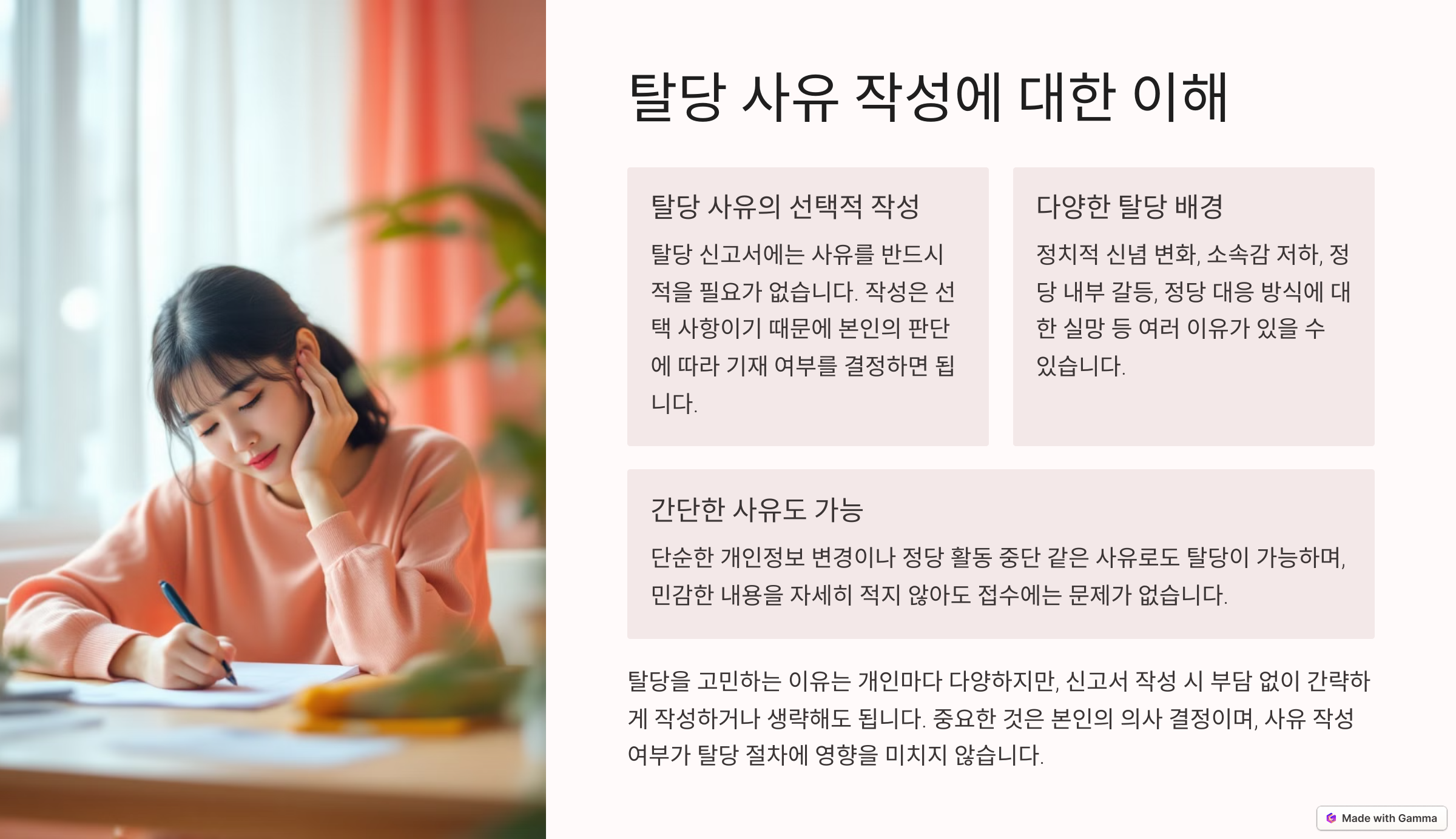 탈당 사유는 개인의 판단에 따라 다양하게 나올 수 있어요. 대표적으로는 아래와 같은 경우들이 있습니다.