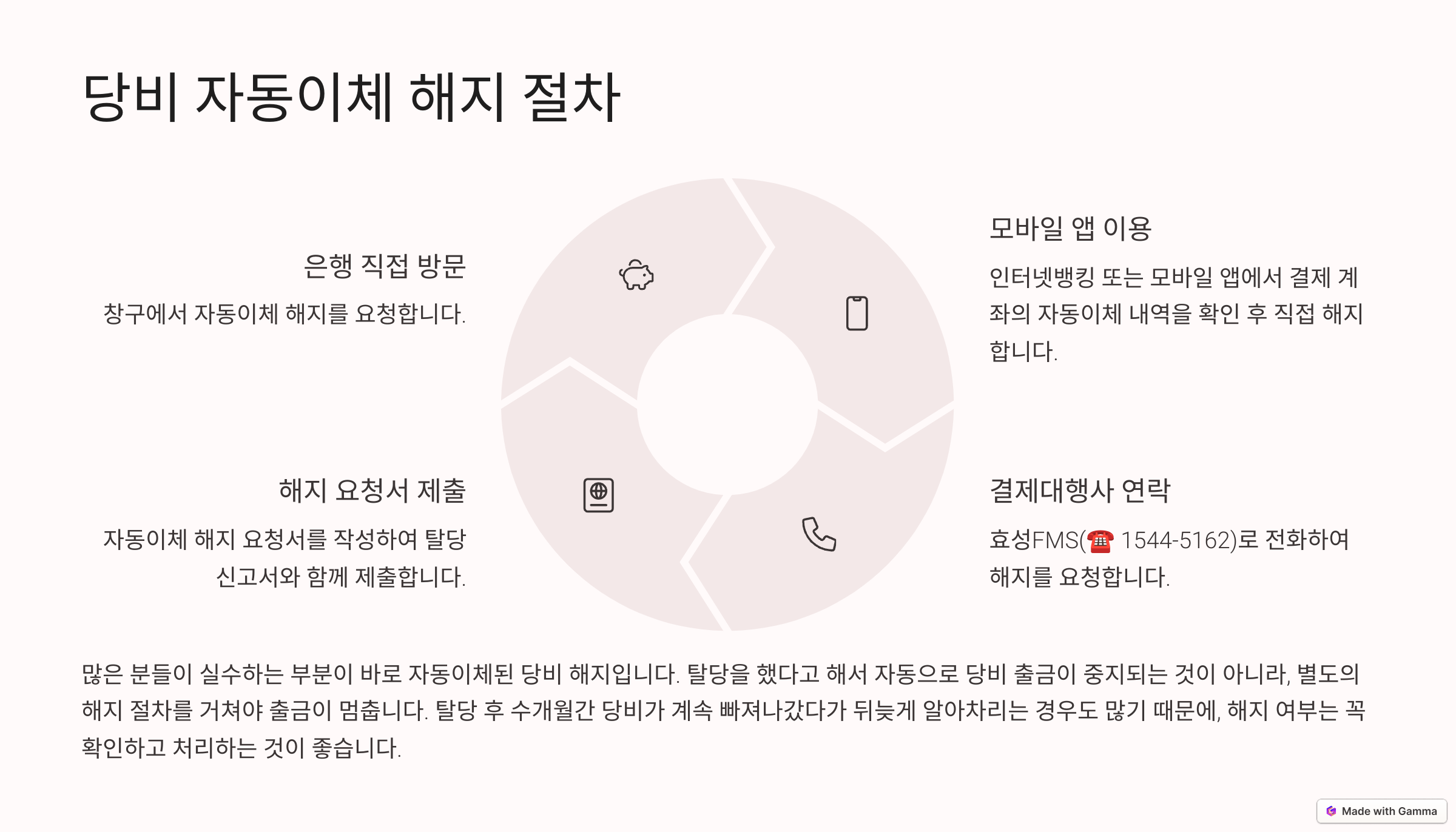 탈당 신고서만 제출한다고 해서 당비 자동이체가 자동으로 중단되지는 않아요. 별도로 해지 절차를 밟아야 하며, 다음과 같은 방법이 있습니다.