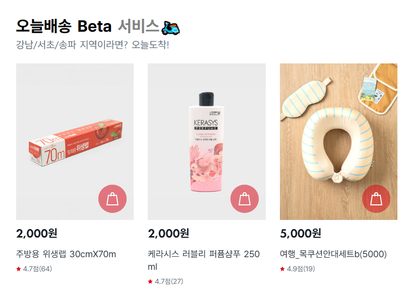 서울 강남, 서초, 송파에서만 1~2시간 내 배송 가능해요. 이후 확대될 예정이라고 하니 참고하세요.