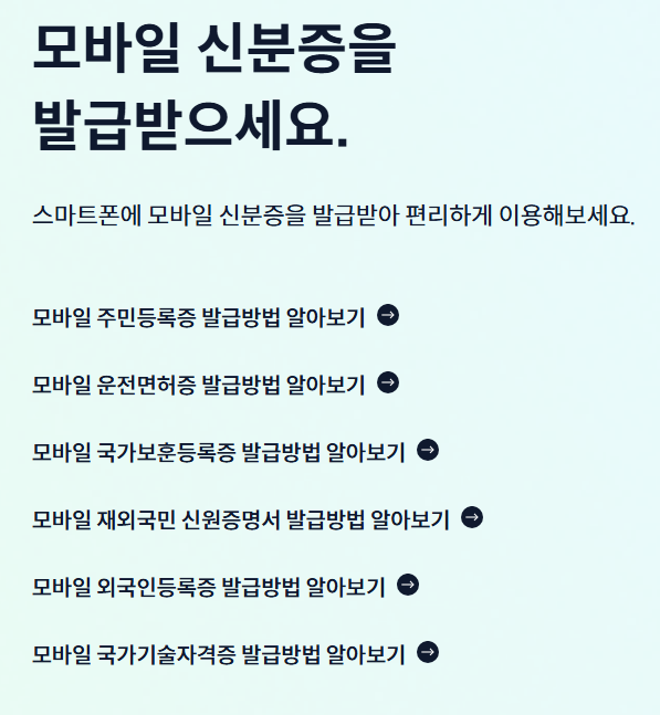 모바일 신분증으로 발급받을수 있는 종류는 다음과 같습니다.