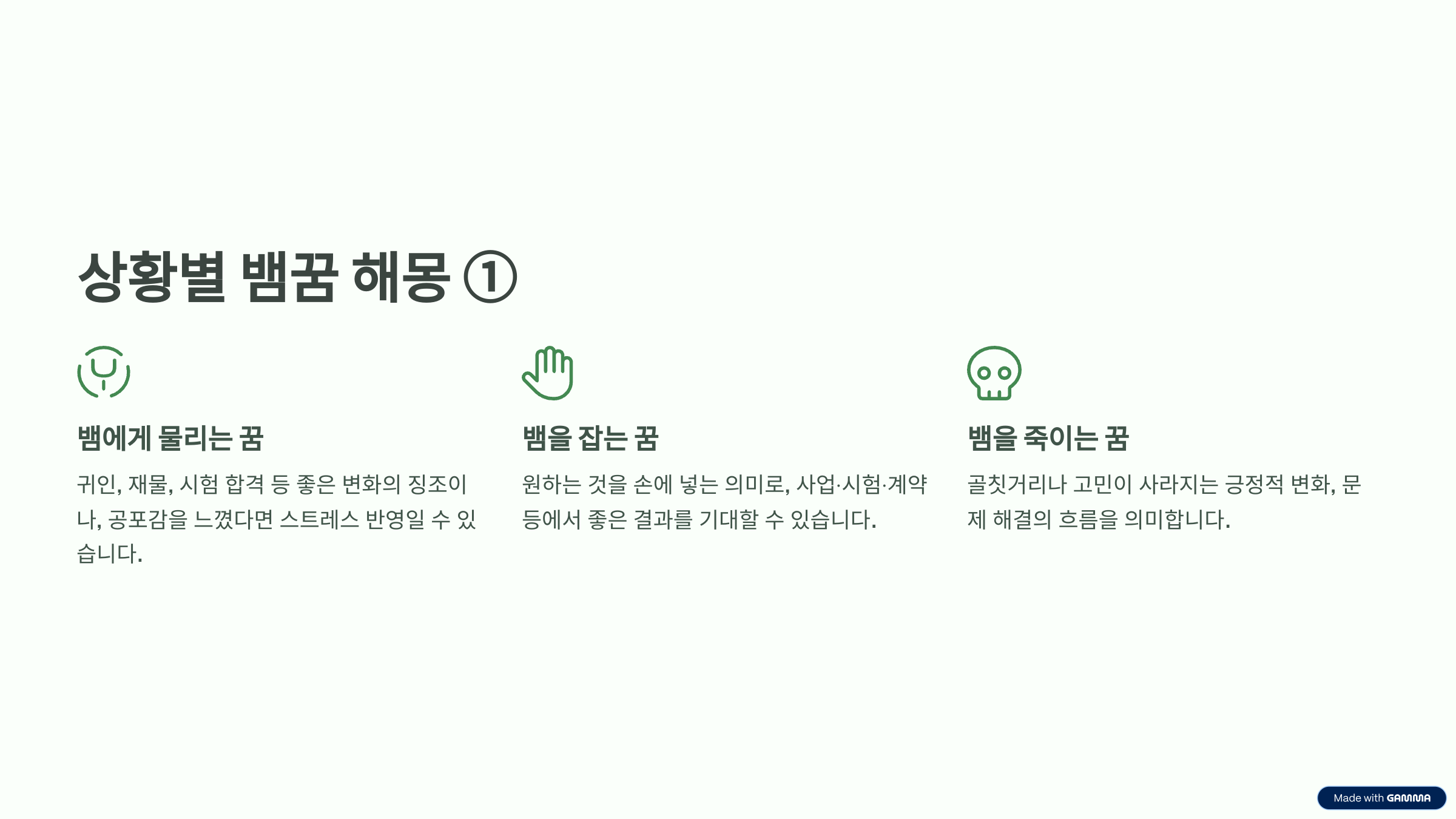 가장 흔히 꾸는 뱀 꿈 중 하나는 뱀에게 물리는 상황이에요. 보통은 금전운이나 행운이 따른다고 해석되지만, 때에 따라 스트레스나 인간관계의 갈등을 상징하기도 해요. 꿈속에서 아프게 물렸다면 실제로 감정적으로 상처받은 상황일 수 있고, 전혀 아프지 않았다면 행운이 찾아오는 전조일 수 있어요.