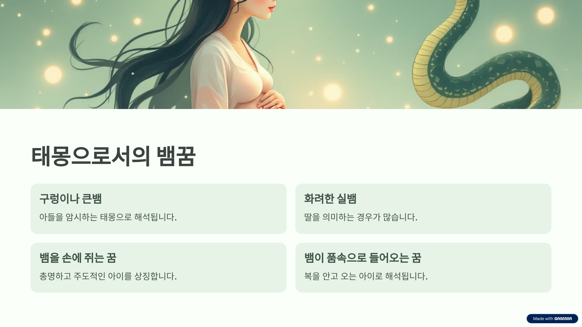 또한 뱀 꿈은 태몽으로 해석되는 경우도 많아요. 구렁이는 아들을, 색이 화려하거나 작고 가는 뱀은 딸을 암시한다는 말도 있어요. 특히 뱀이 품 안으로 들어오거나 감싸는 꿈은, 귀한 아이의 탄생을 의미하는 경우로 받아들여지기도 해요.