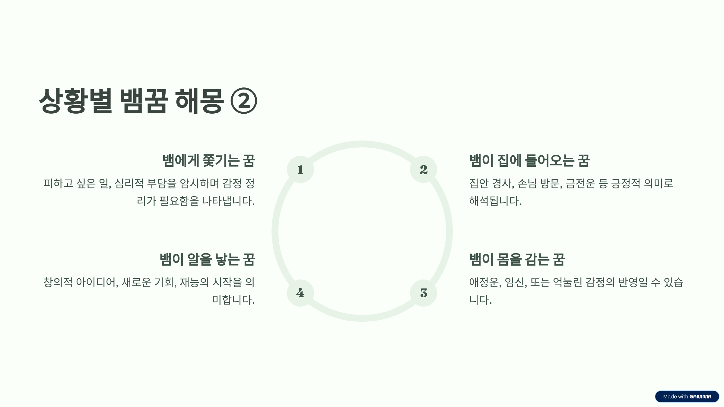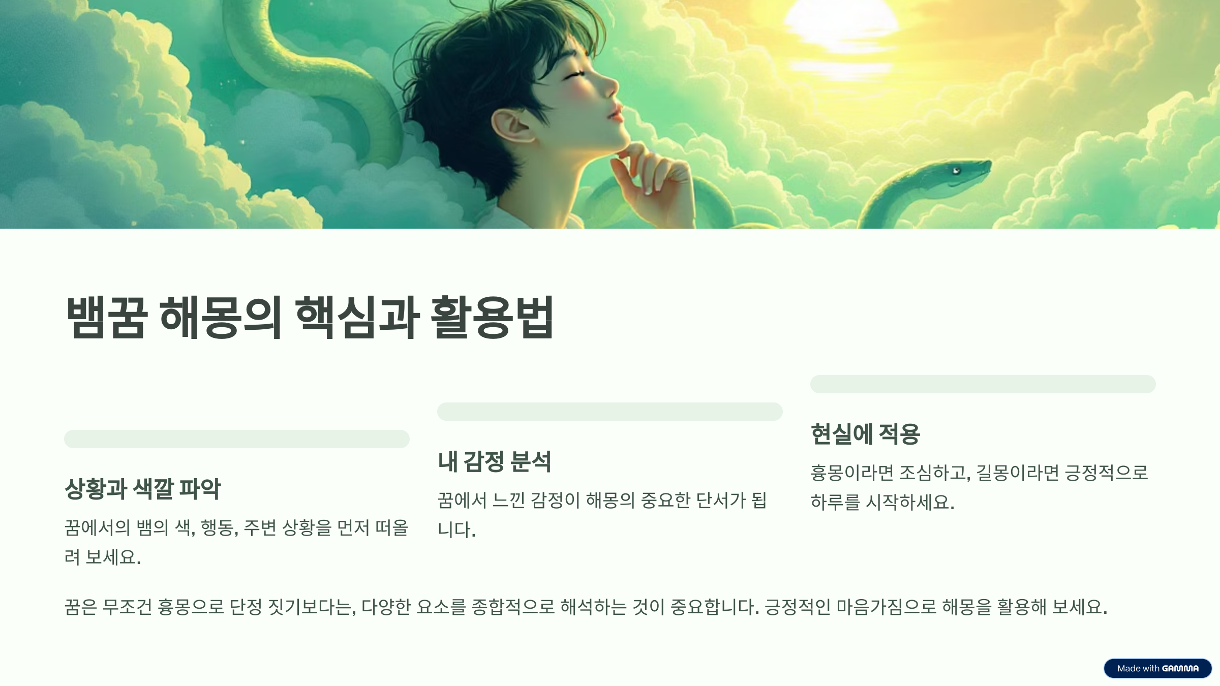꿈은 때로 우리 무의식이 보내는 신호일 수 있어요. 뱀 꿈이 주는 인상이 강렬하더라도, 반드시 불길하거나 두려운 의미만 있는 건 아니에요. 꿈의 상황과 감정, 뱀의 종류 등을 종합적으로 살펴보고 현실 속 나의 상태와 비교해보는 것이 좋습니다. 어디까지나 참고용으로 받아들이고, 현실에서는 마음을 편하게 가지는 것이 가장 중요해요. 뱀이 나오는꿈, 큰뱀 나오는꿈, 작은뱀 나오는꿈 등에 대해 알아 보았습니다.