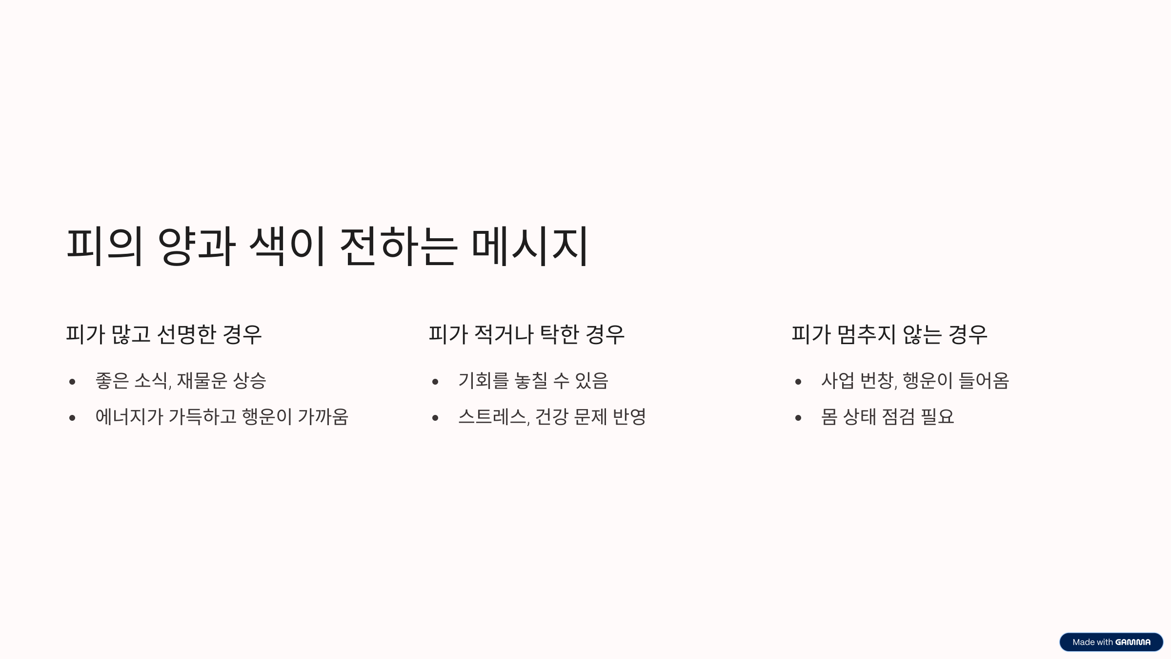 혈의 양이 많은 꿈은 걱정거리가 사라지거나 재물운이 상승할 가능성을 뜻하고, 적은 양은 기회를 놓칠 수 있다는 신호일 수도 있어요. 선혈은 길조, 탁하거나 어두운 색은 경고 신호로 받아들이면 돼요.