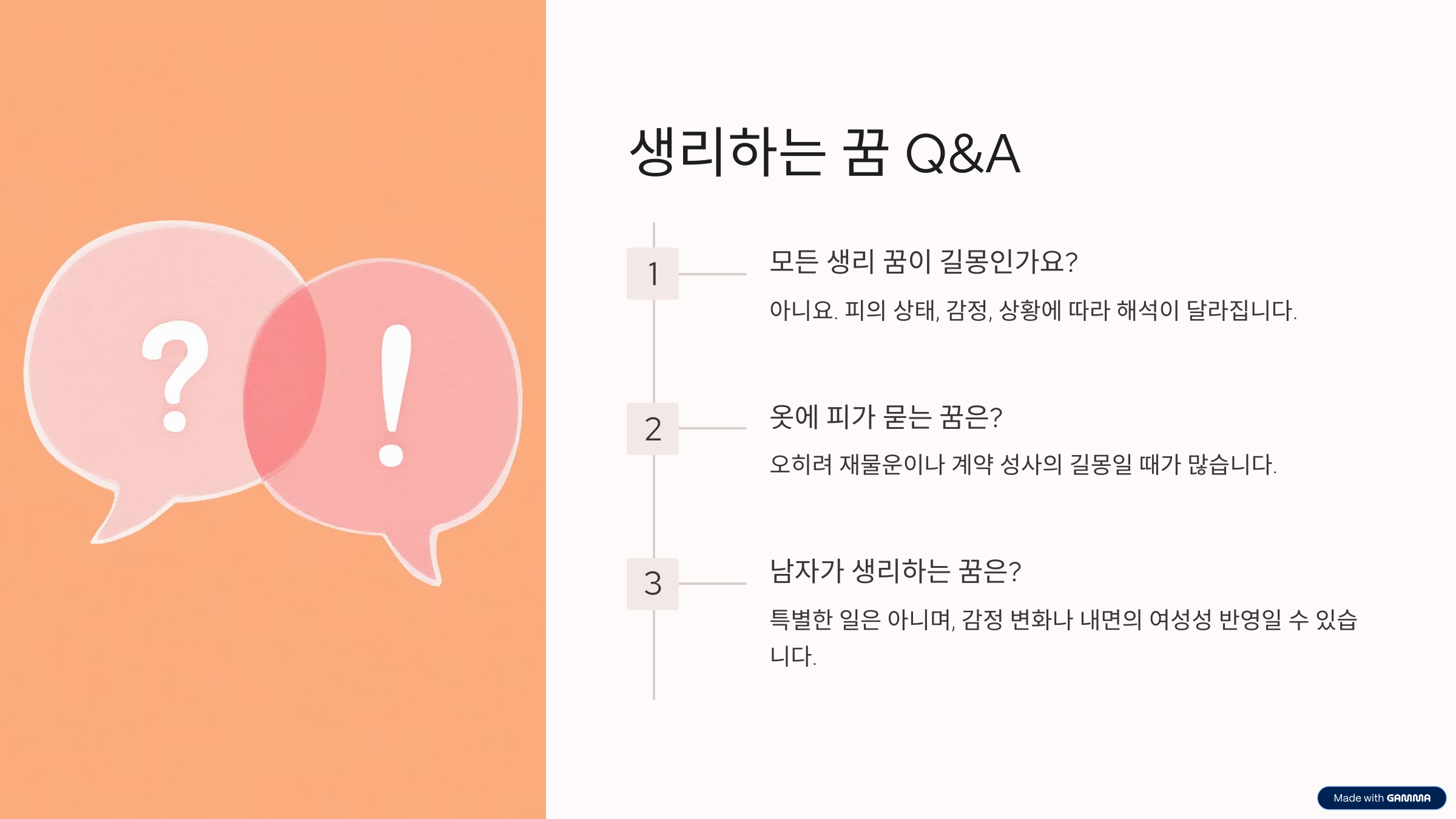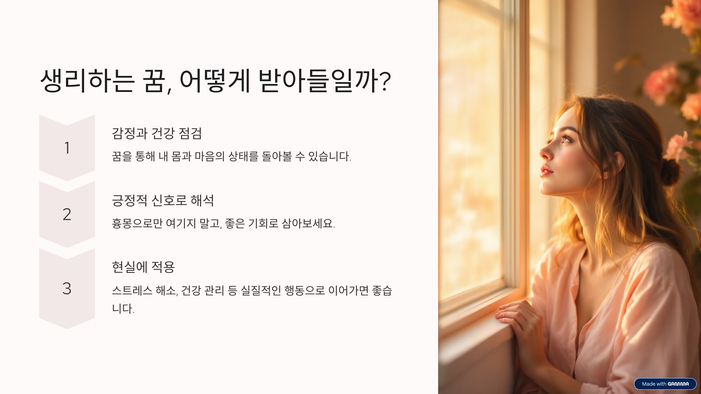 생리하는 꿈은 단순한 생리현상을 넘어서, 감정 상태나 삶의 흐름을 반영하는 메시지가 담긴 경우가 많아요. 꿈에서 느낀 감정이나 상황을 잘 떠올리면서, 지금 내 상태를 돌아보는 기회로 삼아보는 건 어떨까요? 꿈은 어디까지나 참고로 삼되, 현실에 유익하게 반영하는 지혜가 필요해요.