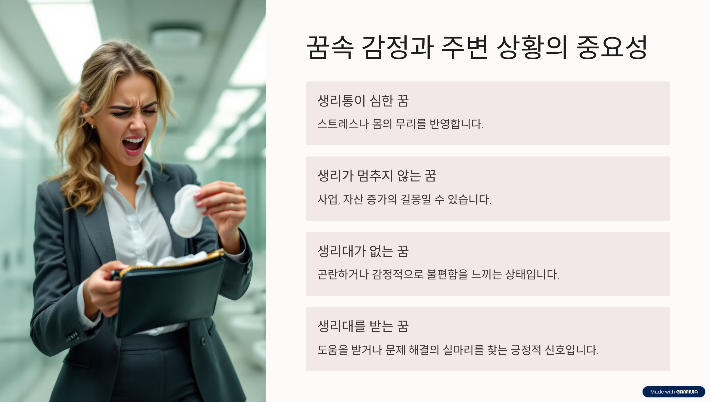 생리통이 심한 꿈은 건강에 대한 경고로 받아들여야 해요. 무리한 일정이나 스트레스가 쌓여 있다는 신호일 수 있죠. 생리가 멈추지 않는 꿈은 오히려 좋은 운이 찾아오는 신호, 예를 들어 사업이나 일이 번창할 가능성을 암시할 수 있어요.