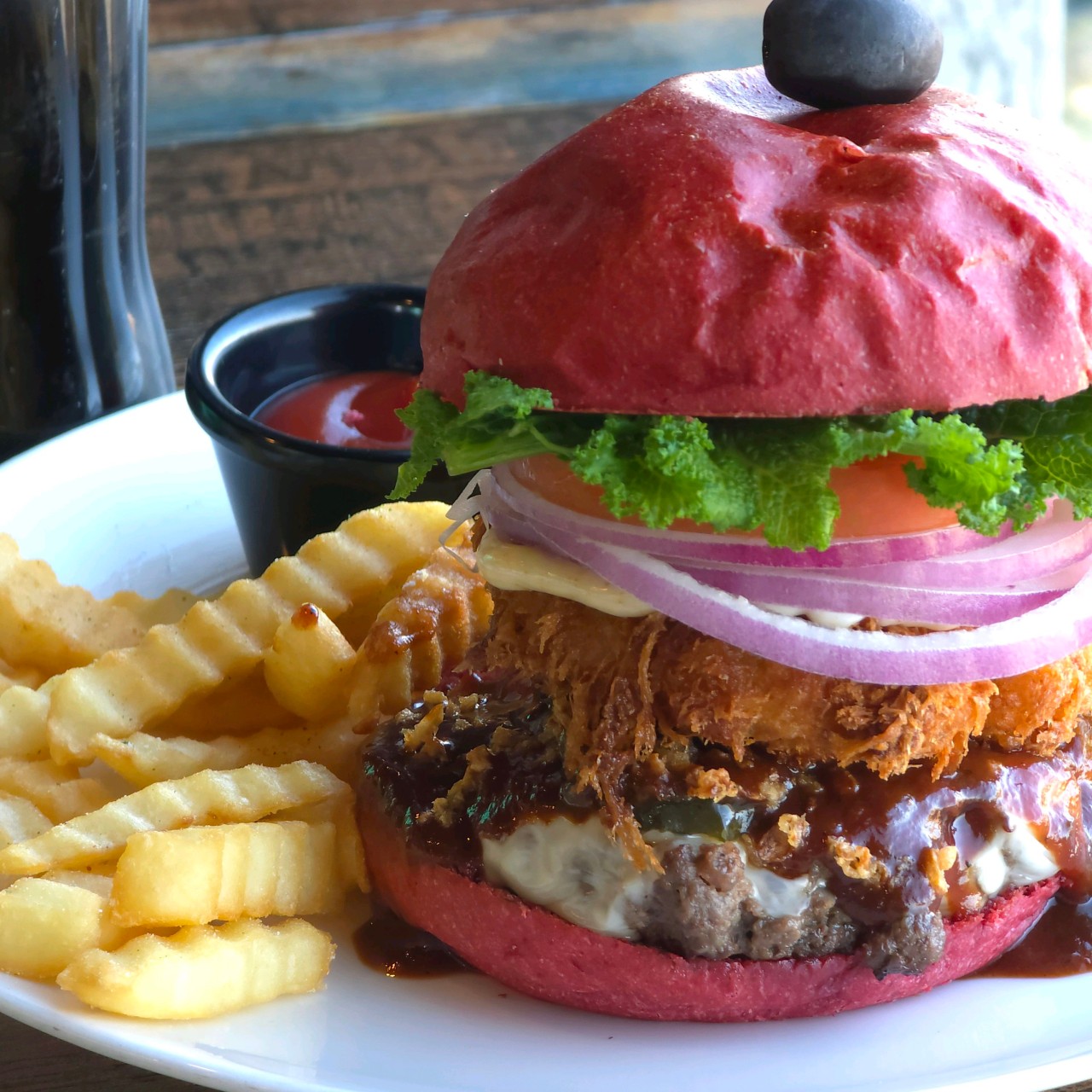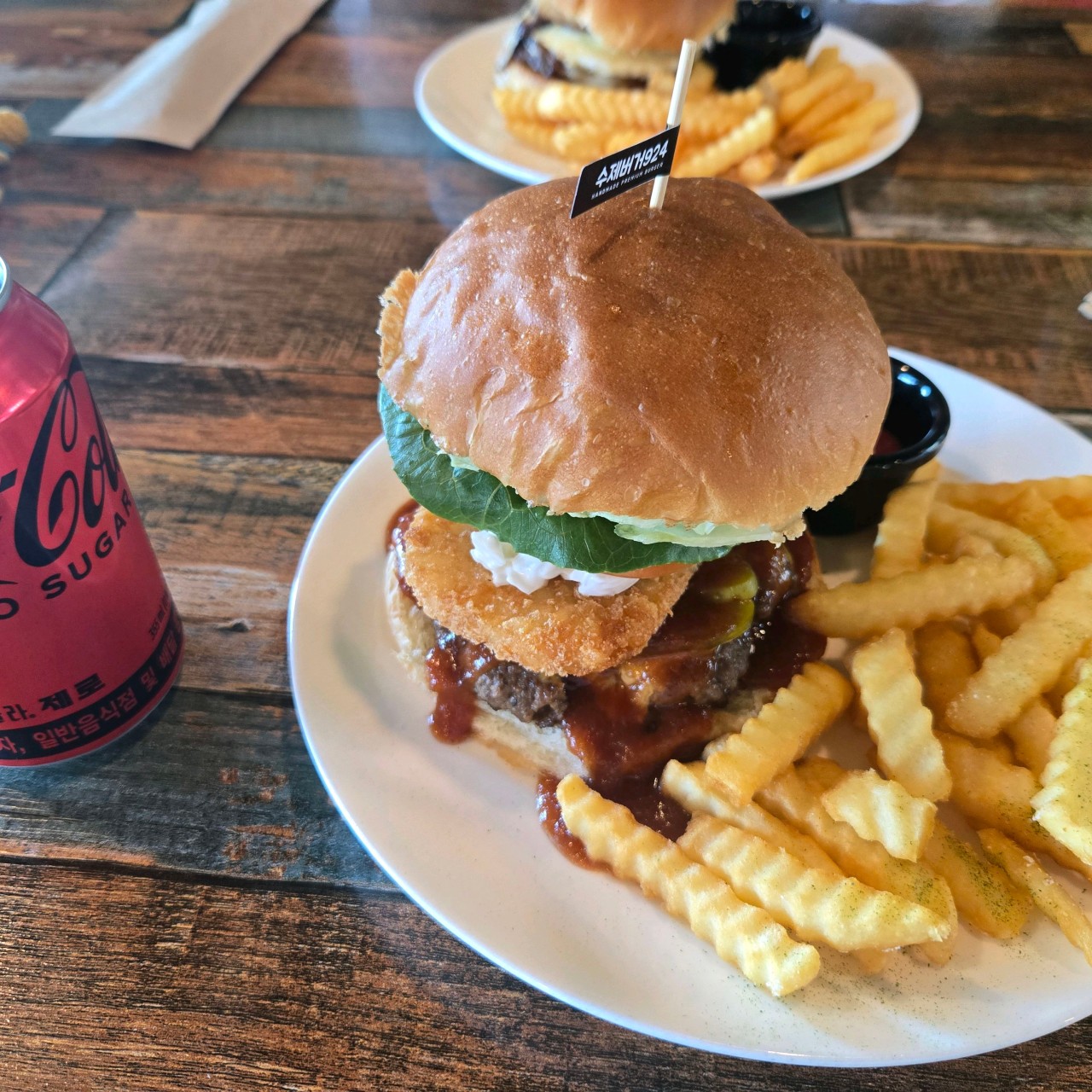 버거 종류만 34가지가 준비되어 있어서 메뉴판을 보면 한참 고민하게 돼요. 대표 메뉴는 지역 특산물인 양평한우를 활용한 버거들이에요. 예를 들어 양평한우 웨스턴쉬림프버거는 한우 패티와 새우 패티가 함께 들어간 독특한 조합이고, 양평한우 파불고기버거는 한우 패티에 파 튀김과 불고기 소스를 더해 한국적인 맛을 살렸어요. 그 외에도 오리지널 스페셜버거, 하와이안 스페셜버거, 블랙 치폴레버거처럼 다양한 조합이 준비되어 있어서 취향 따라 고르기 좋아요.