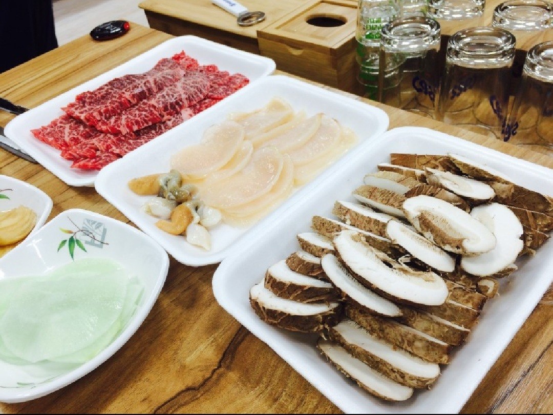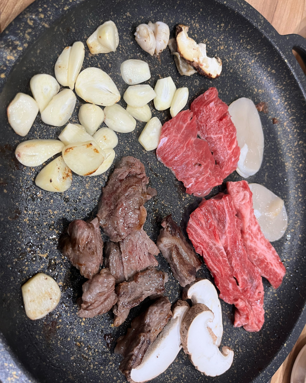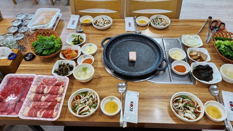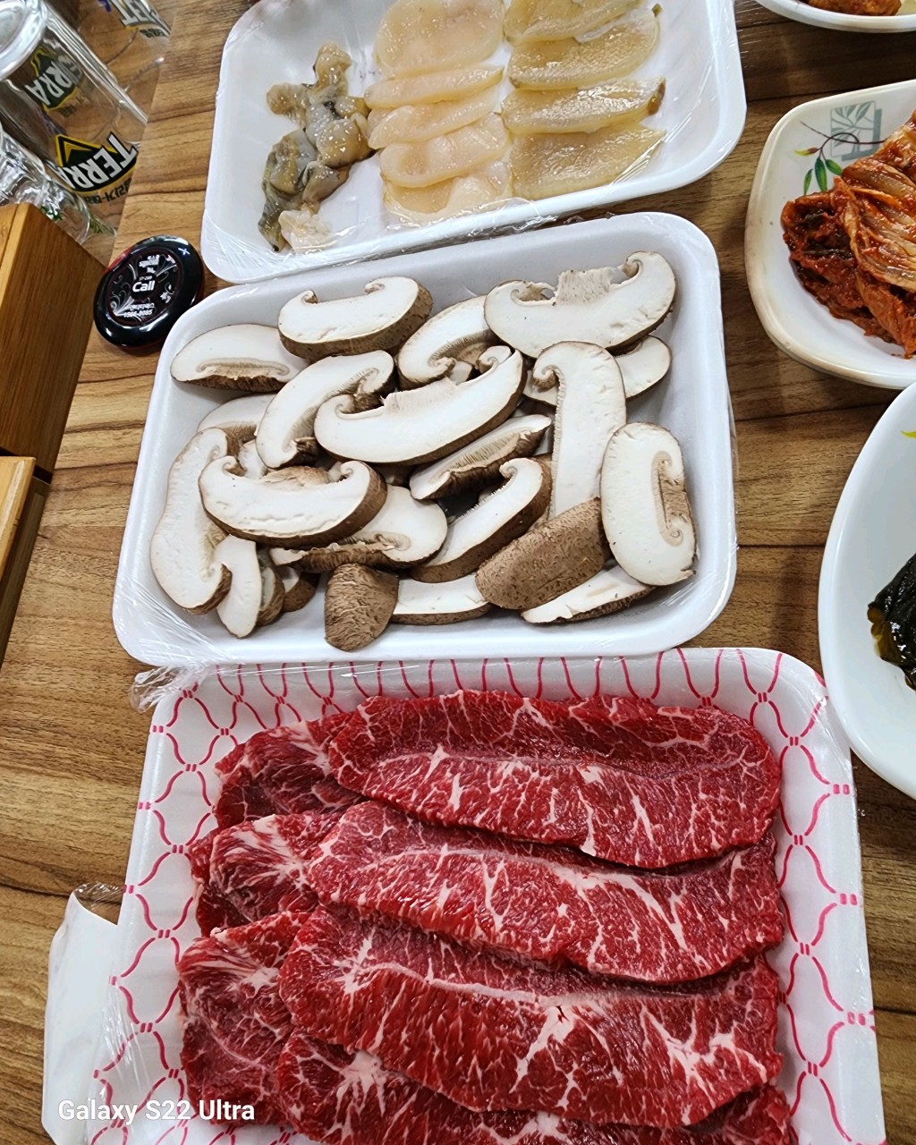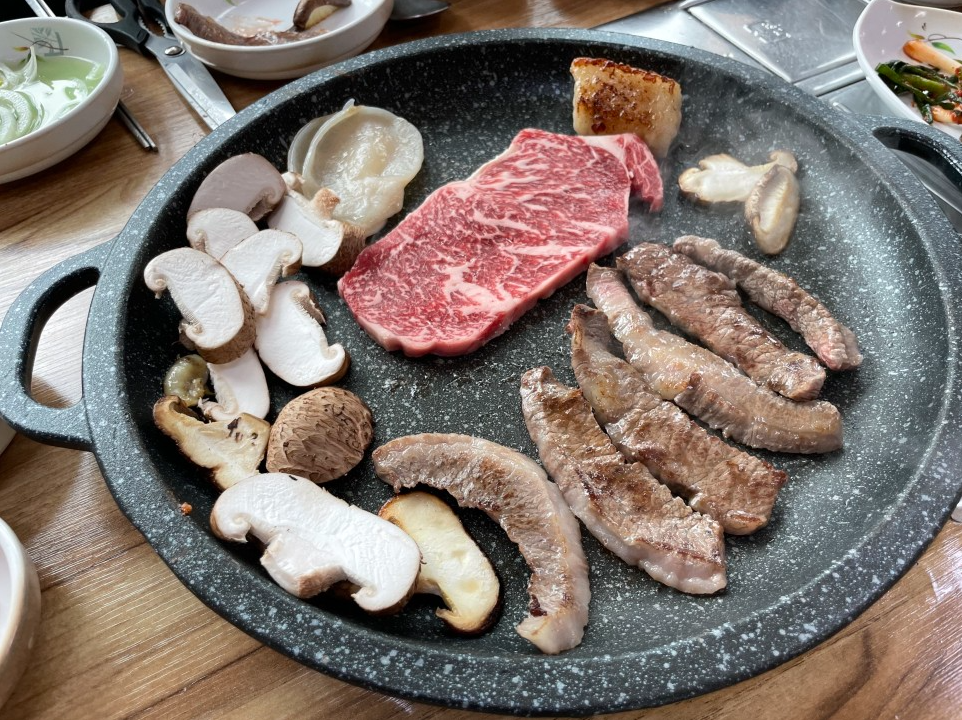 이곳도 장흥 토요시장 내에 위치해 있고, 1층에서 고기와 관자를 구매한 뒤 2층에서 구워 먹는 방식이에요. 전라남도산 김치를 직접 담가 제공하는 점이 특징이에요.