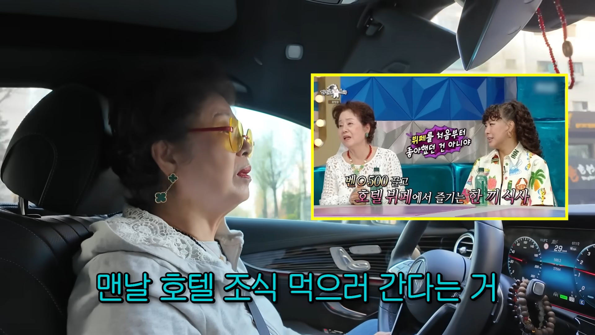 영상은 선우용여 씨가 직접 벤츠 운전대를 잡고 호텔로 향하는 장면으로 시작돼요.