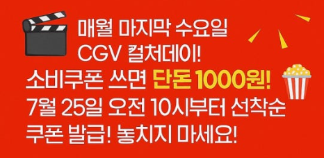 매월 마지막 수요일인 '문화가 있는 날'에는 영화 관람료가 7,000원입니다. 여기에 6천원 할인권을 사용하면, 무려 **1,000원**에 영화를 볼 수 있다는 사실! 문화의 날에 맞춰 영화를 관람하면 최고의 가성비를 누릴 수 있습니다.