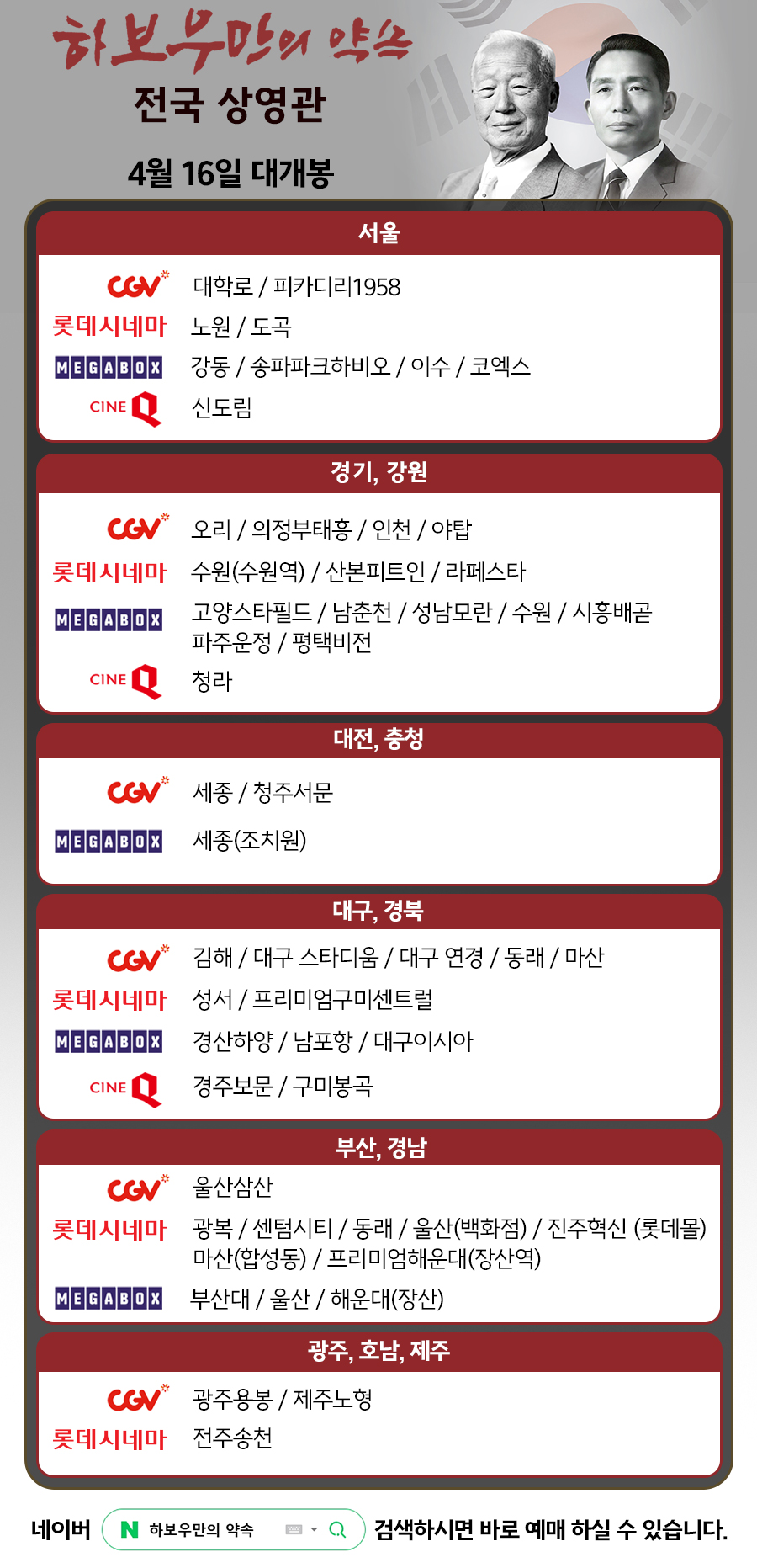 - CGV 상영관 : 대학로, 피카디리1958, 오리, 의정부태흥, 인천, 야탑, 세종, 청주서문, 김해, 대구 스타디움, 대구연경 동래, 마산, 울산삼산, 광주요옹, 제주노형