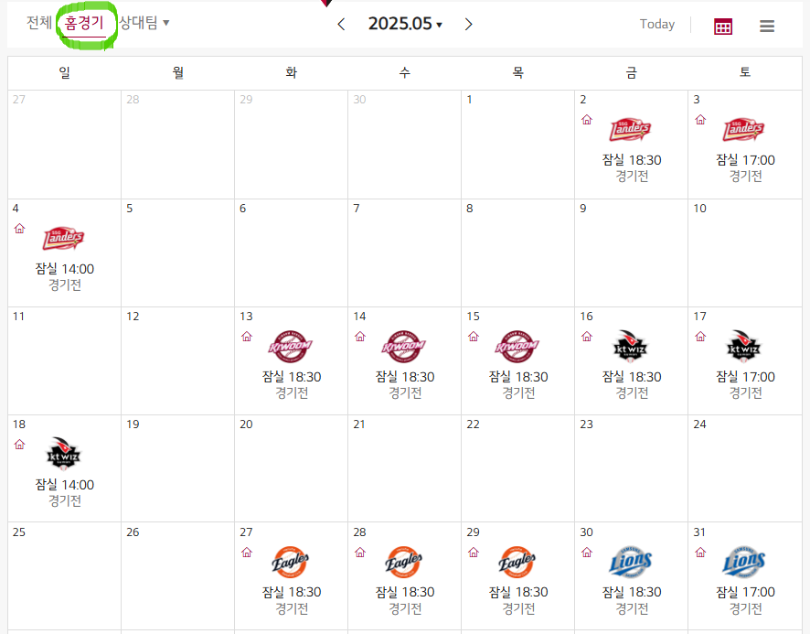 | 5월 1일 (목) | 한화 | 대전 | 18:30 |